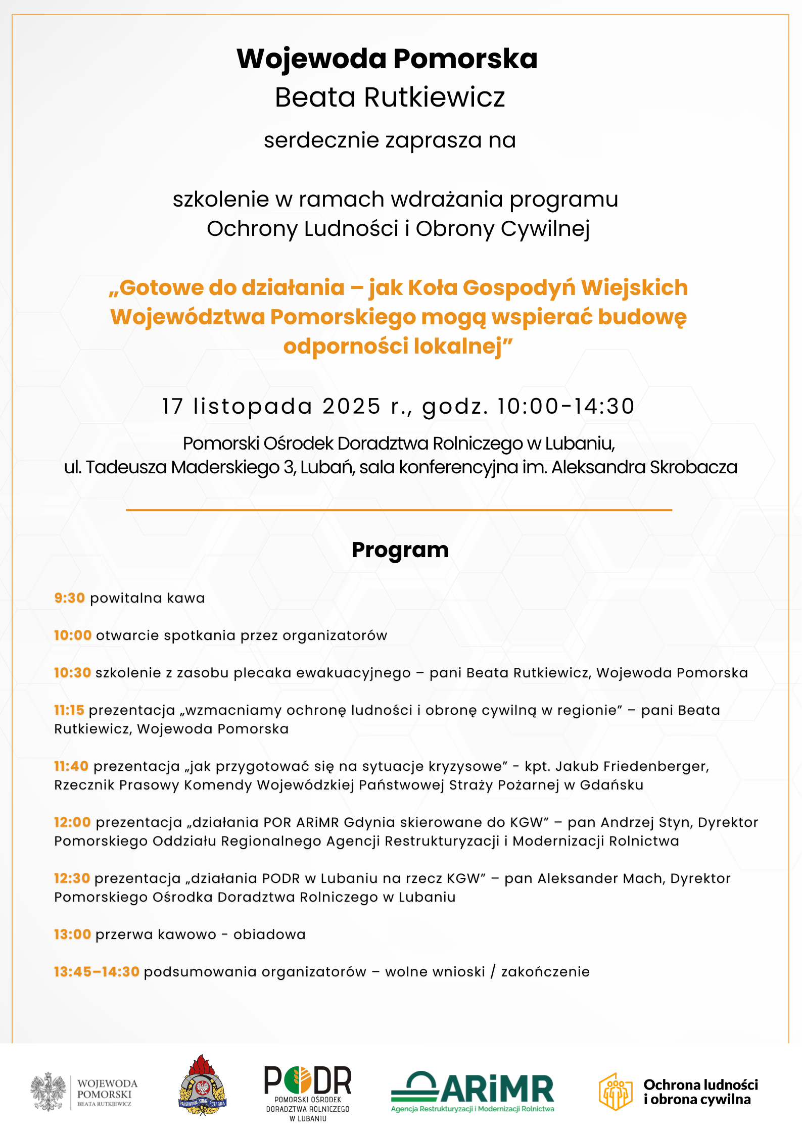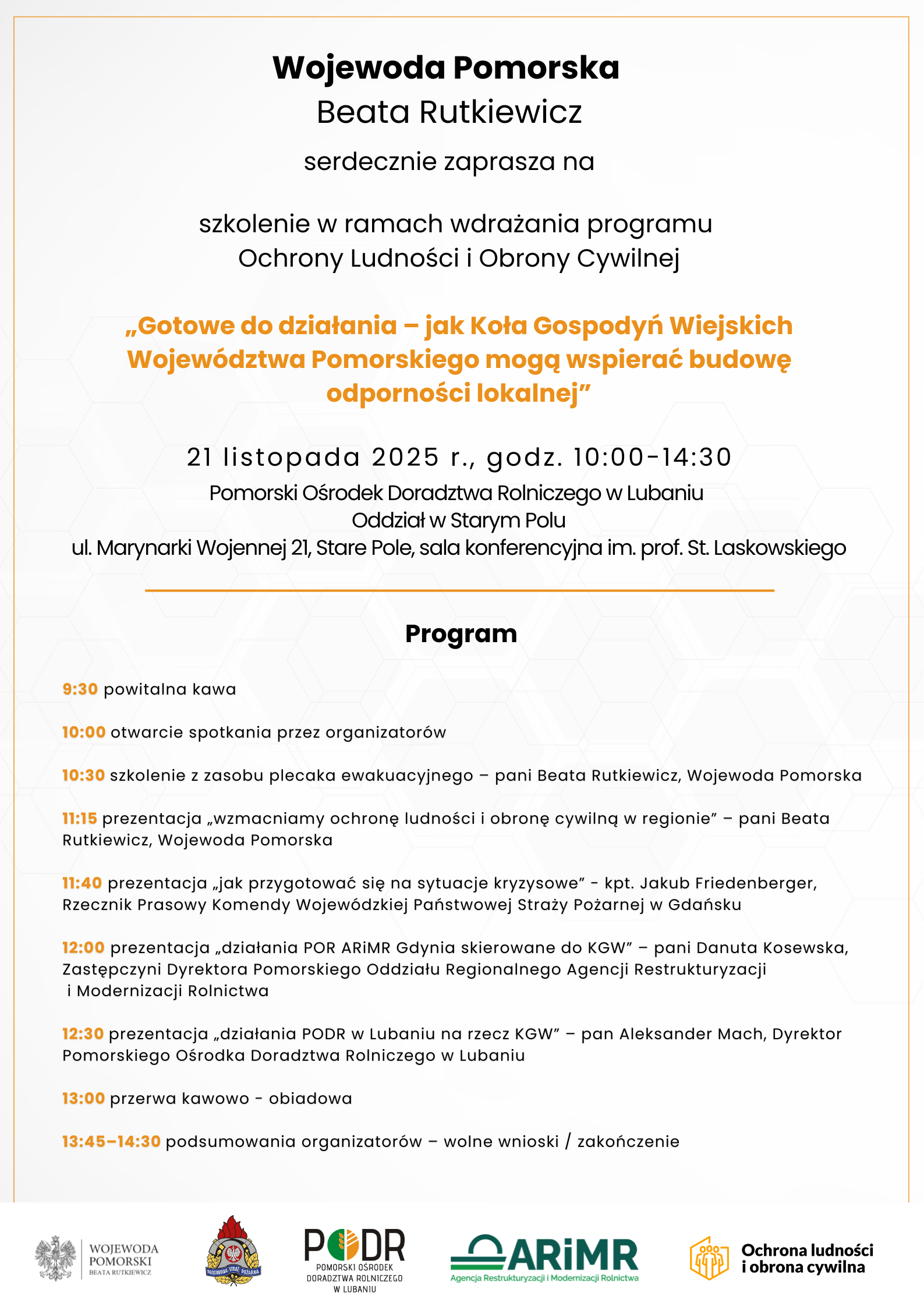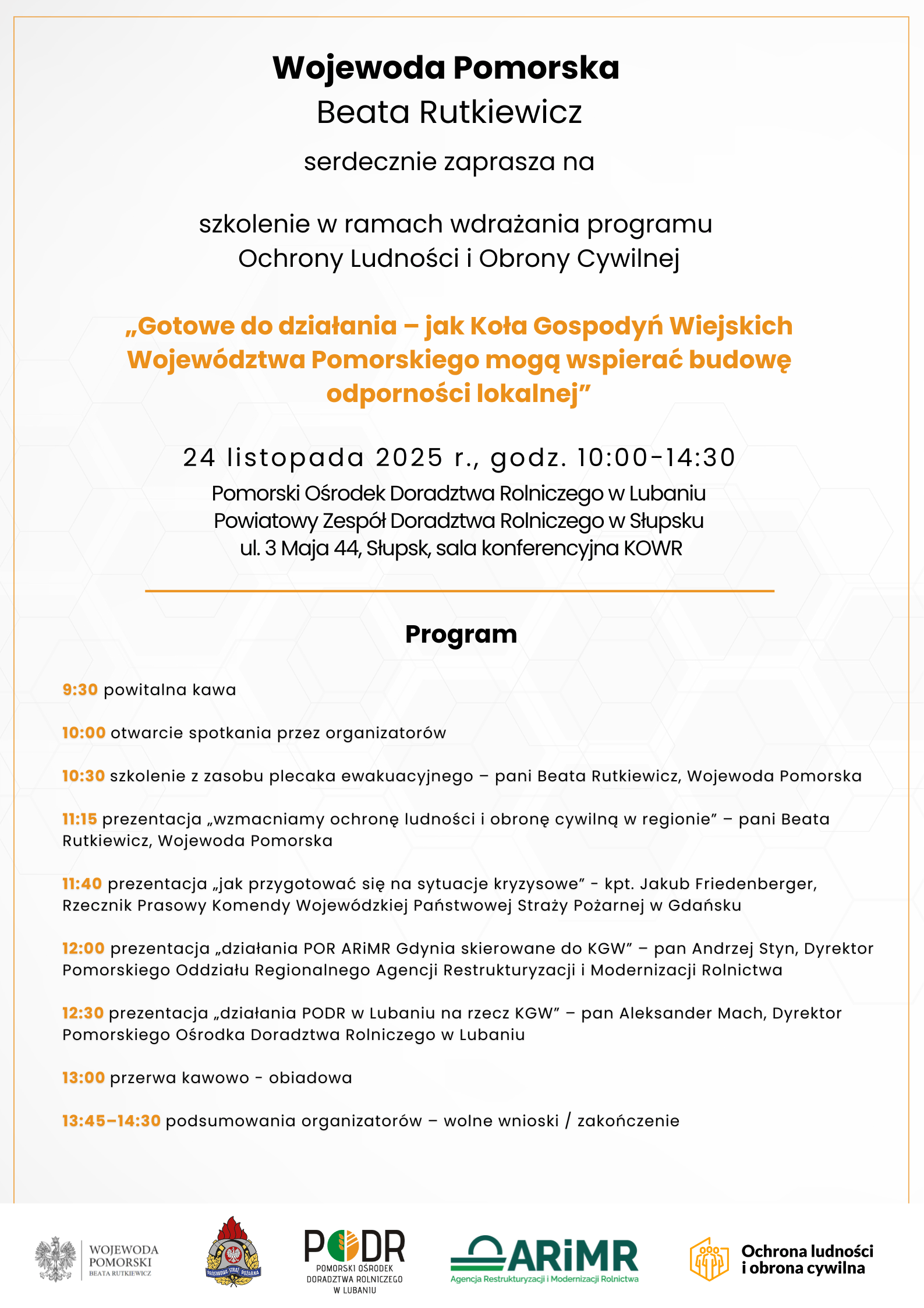 Szkolenie organizowane jest przez Wojewodę Pomorską Beatę Rutkiewicz wspólnie z Pomorskim Ośrodkiem Doradztwa Rolniczego w Lubaniu oraz Pomorskim Oddziałem Regionalnym Agencji Restrukturyzacji i Modernizacji Rolnictwa