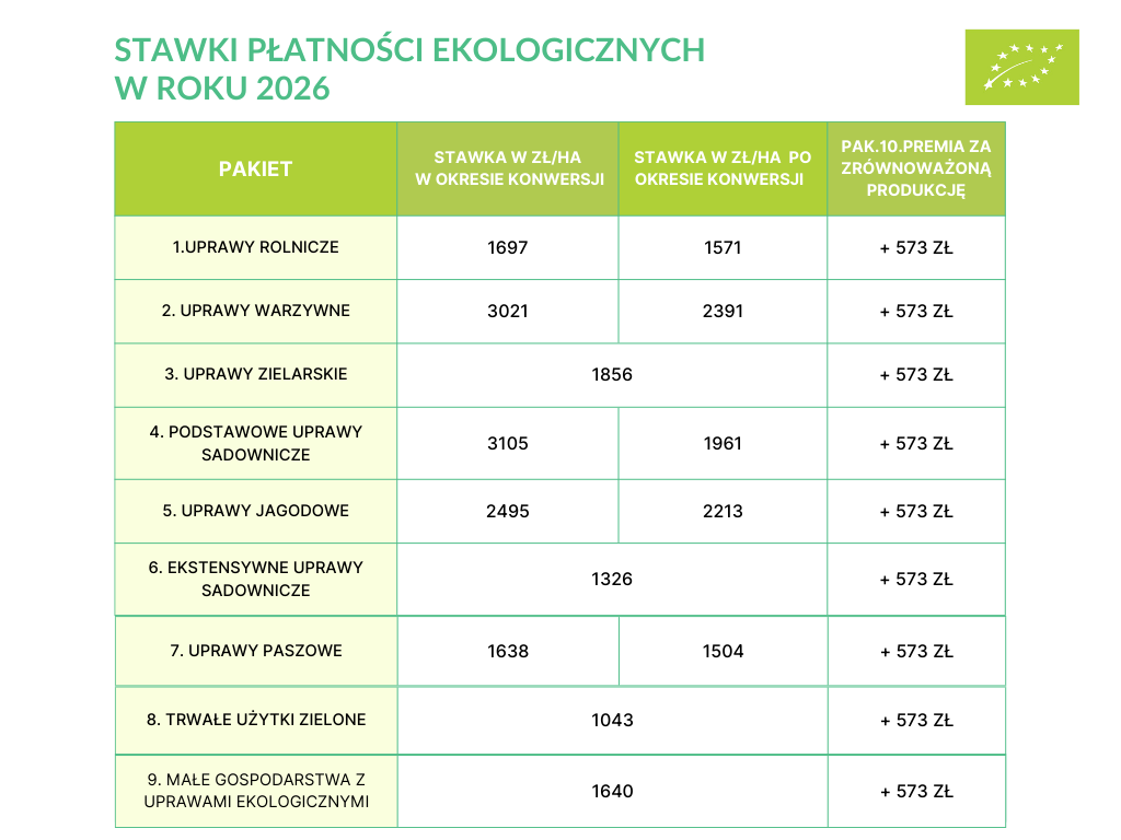 Dla poszczególnych grup upraw są określone inne stawki płatności i są one zróżnicowane ze względu na status danej uprawy, tj. czy jest to uprawa w okresie konwersji, czy  uprawa jest już ekologiczna (po zakończonym okresie konwersji). Stawki płatności w ramach każdego z pakietów interwencji zostały określone jako roczne stawki płatności do jednostki powierzchni, tj. do 1 ha. Stawki płatności w roku 2026 w ramach interwencji dotyczącej rolnictwa ekologicznego, w zależności od grupy upraw i okresu konwersji/po konwersji wynosić będą od 1 043 zł/ha do 3 105 zł/ha. Natomiast w przypadku pakietu pt. Małe gospodarstwa z uprawami ekologicznymi stawka płatności będzie wynosiła 1 640 zł/ha, a stawka za dodatkową premię za zrównoważoną produkcję roślinno-zwierzęcą 573 zł/ha.