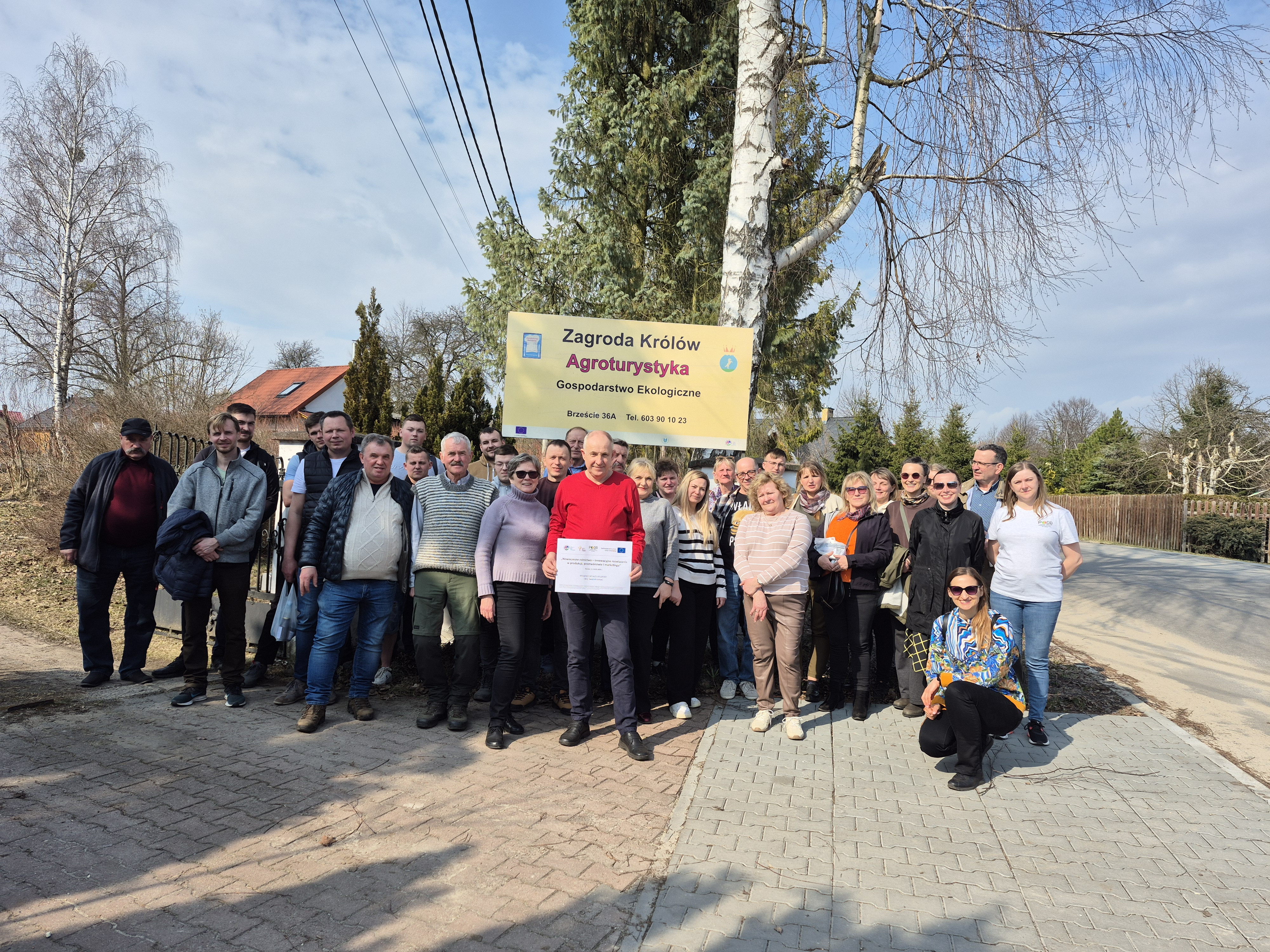 Drugi dzień wyjazdu poświęcony był praktycznym przykładom wdrażania innowacji w rolnictwie. W pierwszej kolejności uczestnicy odwiedzili gospodarstwo rolne Gabrieli i Krzysztofa Król w miejscowości Brzeście. „Zagroda Królów” to rodzinne 30 hektarowe gospodarstwo rolne, ekologiczne i agroturystyczne. Głównym kierunkiem działalności jest tutaj uprawa borówki wysokiej, której plantacja ma już 37-letnią tradycję (właściciele gospodarstwa byli jednymi z pierwszych w Polsce plantatorów tego owocu). Rolnicy posiadają Certyfikat GLOBAL G.A.P., który ułatwia im sprzedaż borówki zarówno w kraju, jak i poza jego granicami. W gospodarstwie przerabia się owoce borówki domowym sposobem na przetwory: dżemy, konfitury, galaretki i soki oraz prowadzi ich sprzedaż w ramach rolniczego handlu detalicznego. Gospodyni jest laureatką licznych konkursów kulinarnych. W okresie zimowym mrożone owoce wykorzystuje się m.in. do pierogów. W gospodarstwie hoduje się też gęś kielecką oraz kury zielononóżki. Hodowli sprzyja rozległy teren gospodarstwa z przydomowym pastwiskiem przeznaczonym na wolny wybieg dla gęsi oraz kur. Wypasa się także owce rasy Świniarka. Ważnym elementem działalności gospodarstwa państwa Król jest także podejście prośrodowiskowe – stosowanie praktyk ograniczających zużycie środków chemicznych, dbałość o strukturę gleby oraz racjonalne gospodarowanie wodą. Podczas spotkania omówiono również kwestie zarządzania gospodarstwem oraz znaczenie współpracy w ramach sieci rolników wdrażających innowacje. Gospodarstwo „Zagroda Królów” znajduje się na Szlaku Świętokrzyskiej Kuźni Smaków.